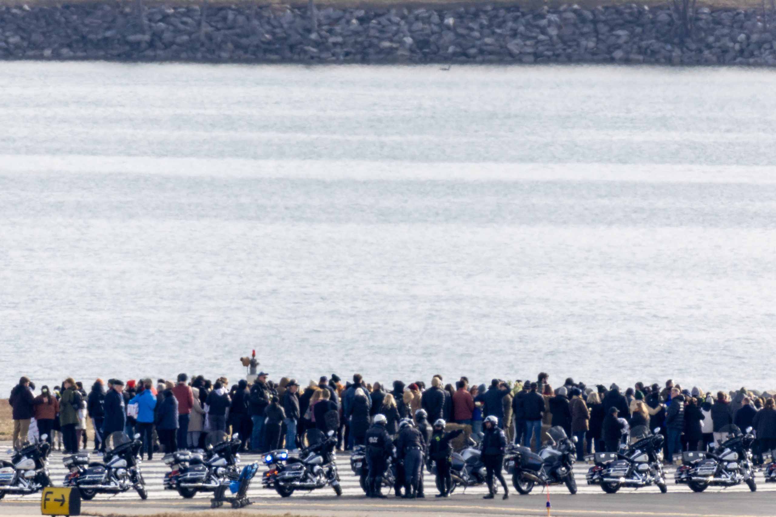 Family members visit the crash site on the banks of the Potomac River, where American Airlines flight 5342 collided with a US Army military helicopter, at Ronald Reagan Washington National Airport in Arlington, Virginia, on February 2, 2025.