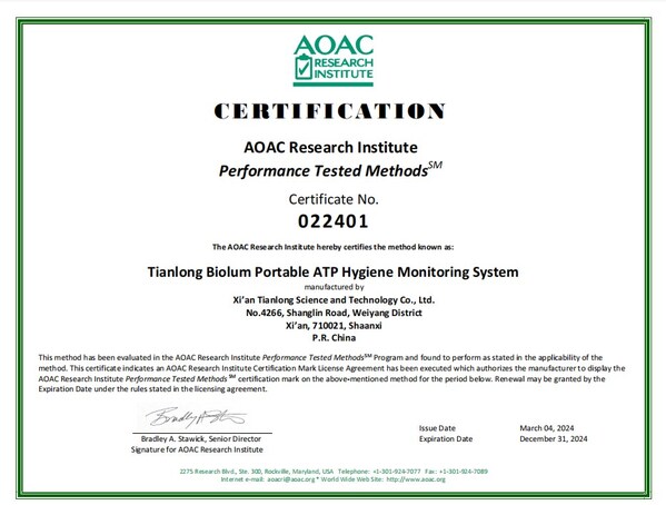 Tianlong’s Biolum Portable ATP Hygiene Monitoring System, a powerful tool for implementing and overseeing hygiene monitoring programs, has achieved outstanding performance, earning certification from the prestigious AOAC Research Institute’s Performance Tested Methods (PTM) Program. The PTM Program developed more than 30 years ago provides independent third-party review and certification for proprietary test method performance, and has played a crucial role with emerging health concerns by providing a widely accepted certification in a fast-to-market context.